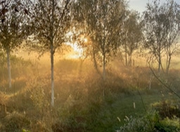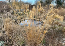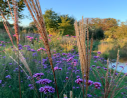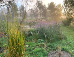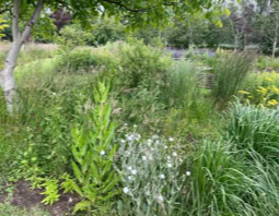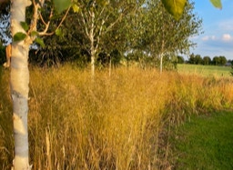 6. Het Berkenbosje: We zijn al in 2014 begonnen met het aanplanten van mooie witte berken, Betula utilis ‘Doorenbos’ achter de vijver. We zochten naar het beeld van berken in hoog wild gras. Dit bleek niet zo makkelijk te realiseren want berken blijken hier notoir lastig aan te planten. Er zijn er dan ook een aantal overleden door engerlingen en droogte. We hebben deze vervangen door kleinere exemplaren en andere soorten en het begint nu ergens op te lijken. Er staat een middenberm van Deschampsia cespiosa, die zich verder mag uitzaaien, aangevuld met Verbena bonariensis. Aan de rand staan een paar Rhododendron luteum, gele Azalea, die door de natte laatste winters ook goed aanslaan. Grenzend aan de vijverzone staat nog de donkerbladige berk Betula ‘Crimson Frost’, wat de twee gebieden mooi verbindt.