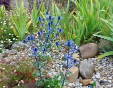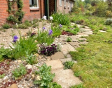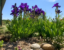 1. De Grindborder. Deze zijn we begonnen in 2020 en in 2026 uitgebreid Het is zich goed aan het ontwikkelen. Dit was een stuk gazon dat er altijd slecht uitzag omdat het op een zuidhelling ligt en de engerlingen deze plek bijzonder waardeerden. Vandaar een border met maasgrind. Hier staan droogtebestendige planten. Het blijkt al dat de Iris Germanica het hier erg goed doen. Sedums staan er mooier bij dan elders en ook de Erigeron karvinskianu, de fijnstraal, doet het hier geweldig (maar die doen het overal bij ons). In de punt staat de Buddleja ‘White profusion die er ook erg op zijn gemak bij staat. Dit tuindeel krijgt geen extra water van ons en heeft al een paar droge zomers prima doorstaan.