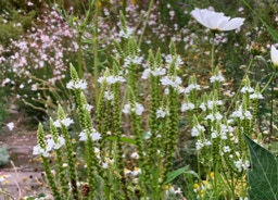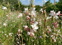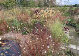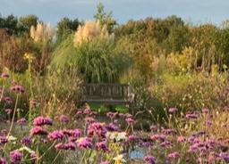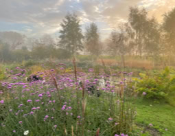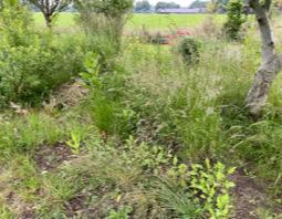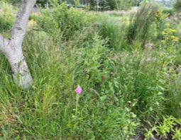 5a. Het Grassenveld: Dit deel is sinds 2018 in ontwikkeling en de naam zegt het al; een veldje met verschillende grassen, aangevuld met wat interessante planten en dit alles rondom onze “Kleine Noot’. Het eerste plantplan is volledig om zeep geholpen door de engerlingen, maar daarna ontstond wel een mooie wilde bende met verschillende aanwaaigrassen. We zijn dat nu aan het redigeren en leuke dingen bijplanten. De door ons geplante Molinia ‘Windspiel’ en Calamagrostis ‘Karl Förster’ zijn de basis maar ook de witte prikneus en Achilea. We experimenteren nu met andere grassen als Briza media en bijzondere Penisetum, aangevuld met bijvoorbeeld Patrinia en Verbena hastata alba. Spannend!