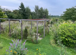 Begin 2025 is er een pergola gebouwd en die is ook de spannende en geheime entree als die begroeid is met Clematis vitalba en klimop. Die geeft ook meteen wat hoogte in dit deel van de tuin.