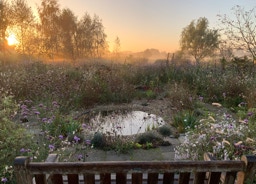5. De Vijverzone: Bij het uitgraven is met de grond een heuveltje langszij de vijver gemaakt. Daarop staan droogteminnende planten als Euphorbia myrsinites, Sedum, Phlomis, Santolina, Nepeta ‘Walkers Low’ en Anaphalis. In de naturalistisch ogende folievijver staat bijvoorbeeld Eniophorum, Juncus, Alisma lanceolatum, Potamogetum, Pontederia enz. Rondom staan Rheum, koningsvaren Osmunda regalis en Geum. De vijverzone wordt aan de zuidkant begrenst door een rij wilgen; een drietal kronkelwilgen (opgekweekt van paastakken), de Salix purpurea ‘Nacy Saunders’ en de Salix exigua. Aan de oostkant loopt het over in het Berkenbosje met als startpunt de prachtige donkerbladige berk, Betula ‘Crimson Frost’.