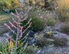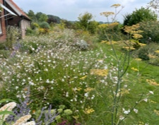 5a. Het Grassenveld: Dit deel is sinds 2018 in ontwikkeling en de naam zegt het al; een veldje met verschillende grassen, aangevuld met wat interessante planten en dit alles rondom onze “Kleine Noot’. Het eerste plantplan is volledig om zeep geholpen door de engerlingen, maar daarna ontstond wel een mooie wilde bende met verschillende aanwaaigrassen. We zijn dat nu aan het redigeren en leuke dingen bijplanten. De door ons geplante Molinia ‘Windspiel’ en Calamagrostis ‘Karl Förster’ zijn de basis maar ook de witte prikneus en Achilea. We experimenteren nu met andere grassen als Briza media en bijzondere Penisetum, aangevuld met bijvoorbeeld Patrinia en Verbena hastata alba. Spannend!