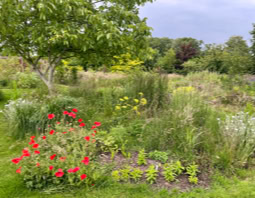9. De Bosrand: We zijn de tuin begonnen met het aanleggen van een houtsingel met traditionele bomen en struiken. De oostkant hiervan is onderdeel van De Bosrand. Hier staan Robinia’s, een prachtige Gleditia, een nog kleine Sassafras en en een groepje Fluweelbomen. Er loopt een lommerrijk hoofdpad doorheen en natuurlijk een paar spannende jonge-onderzoekers-paadjes. Dit is het schaduwdeel van de tuin aan het worden met een mooie bosrand beplanting en meer schaduwminnende planten. Hier staat Elvenbloem, Epimedium, diverse Thalictrum en een bollenveldje om het voorjaar op te vrolijken. Zoals veel delen is dit ook continue in ontwikkeling. Onze hoofdroute leidt door de bosrand en je kunt er via paadjes langs De Geheime tuin en De Tweemetertuin komen.