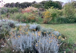 In het wilde gazon ligt een heuveltje met grijsbladige, droogtebestendige planten als Nepeta, Helichysum Italicum en Santolina chamaecyparissus. Her en der staat een Calendula voor een beetje oranje dat dan mooi combineerd met het grijsbladige.